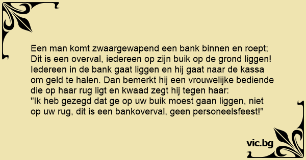"Ik heb gezegd dat ge op uw buik moest gaan liggen, niet op uw rug, dit is een bankoverval, geen personeelsfeest!"