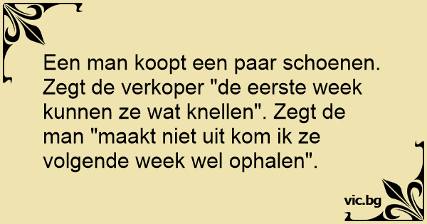 Een man koopt een paar schoenen. Zegt de verkoper "de eerste week kunnen ze wat knellen". Zegt de man "maakt niet uit kom ik ze volgende week wel ophalen".
