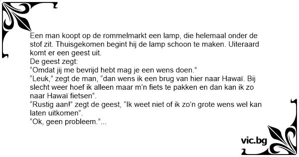 “Leuk,” zegt de man, “dan wens ik een brug van hier naar Hawaï. Bij slecht weer hoef ik alleen maar m’n fiets te pakken en dan kan ik zo naar Hawaï fietsen”.