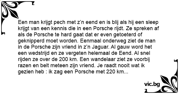 Een man krijgt pech met z’n eend en is blij als hij een sleep krijgt van een kennis die in een Porsche rijdt. Ze spreken af als de Porsche te hard gaat dat er even getoeterd of geknipperd moet worden. Eenmaal onderweg ziet de man in de Porsche zijn vriend in z’n Jaguar. Al gauw word het een wedstrijd en ze vergeten helemaal de Eend. Al snel rijden ze over de 200 km. Een wandelaar ziet ze voorbij razen en belt meteen zijn vriend. Je raadt nooit wat ik gezien heb : ik zag een Porsche met 220 km voorbij razen, daarna een Jaguar met 220 km en dan zag ik een lelijk eendje dat aan het toeteren en knipperen was om voorbij te mogen gaan !!!!!!!!!!!!!!!