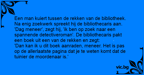 Een man kuiert tussen de rekken van de bibliotheek. Na enig zoekwerk spreekt hij de bibliothecaris aan. 'Dag meneer', zegt hij, 'ik ben op zoek naar een spannende detectiveroman'. De bibliothecaris pakt een boek uit een van de rekken en zegt: