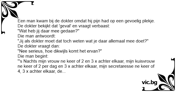 Elmegy egy férfi az orvoshoz és elpanaszolja, hogy a nemi szerve sokat fáj. Az orvos nem talál semmi szervi bajt, ezért megkérdezi: - Milyen a szexuális élete? - Normális. - Lehetne részletesebben?...