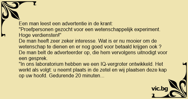 "In ons laboratorium hebben we een IQ-vergroter ontwikkeld. Het werkt als volgt: u neemt plaats in de zetel en wij plaatsen deze kap op uw hoofd. Gedurende 20 minuten krijgt u stroomstootjes toegediend, die er voor zorgen dat uw hersenen positief gestimuleerd worden. Na 20 minuten zal uw IQ een waarde bereiken van 190." zegt de professor. "Het gevaar van deze proef is echter, dat wanneer u te lang onder de kap verblijft, dat het tegenovergestelde bereikt wordt. Uw IQ is dan nagenoeg gedaald tot nul."