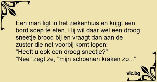 Een man ligt in het ziekenhuis en krijgt een bord soep te eten. Hij wil daar wel een droog sneetje brood bij en vraagt dan aan de zuster die net voorbij komt lopen: