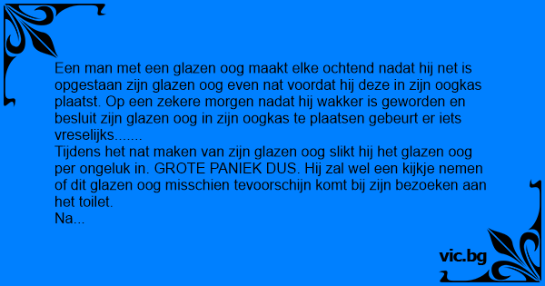 Tijdens het nat maken van zijn glazen oog slikt hij het glazen oog per ongeluk in. GROTE PANIEK DUS. Hij zal wel een kijkje nemen of dit glazen oog misschien tevoorschijn komt bij zijn bezoeken aan het toilet.