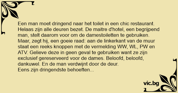 Een man moet dringend naar het toilet in een chic restaurant. Helaas zijn alle deuren bezet. De maitre d'hotel, een begrijpend man, stelt daarom voor om de damestoiletten te gebruiken. Maar, zegt hij, een goeie raad: aan de linkerkant van de muur staat een reeks knoppen met de vermelding WW, WL, PW en ATV. Gelieve deze in geen geval te gebruiken want ze zijn exclusief gereserveerd voor de dames. Beloofd, beloofd, dankuwel. En de man verdwijnt door de deur.