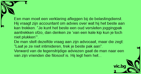 Een man moet een verklaring afleggen bij de belastingdienst. Hij vraagt zijn accountant om advies over wat hij het beste aan kan trekken. “Je кunт het beste een oud versleten joggingpak aantrekken ofzo, dan denken ze ‘van een kale kip kun je toch niet plukken’”.