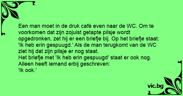 'Ik heb erin gespuugd.' Als de man terugkomt van de WC ziet hij dat zijn pilsje er nog staat.