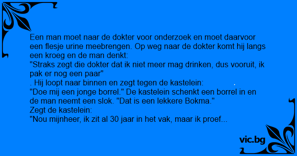 Een man moet naar de dokter voor onderzoek en moet daarvoor een flesje urinе meebrengen. Op weg naar de dokter komt hij langs een kroeg en de man denkt: