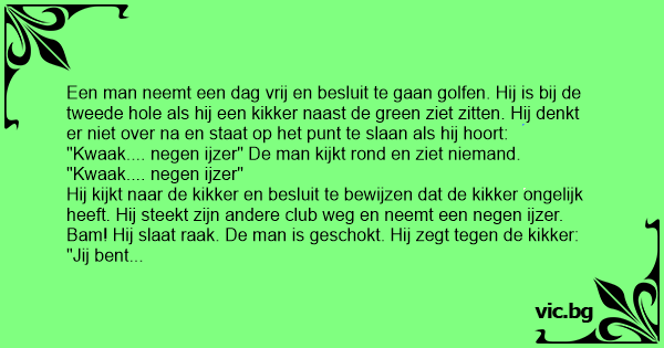 Een man neemt een dag vrij en besluit te gaan golfen. Hij is bij de tweede hole als hij een kikker naast de green ziet zitten. Hij denkt er niet over na en staat op het punt te slaan als hij hoort: