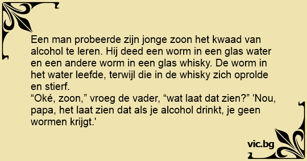 Een man probeerde zijn jonge zoon het kwaad van alcohol te leren. Hij deed een worm in een glas water en een andere worm in een glas whisky. De worm in het water leefde, terwijl die in de whisky zich oprolde en stierf.