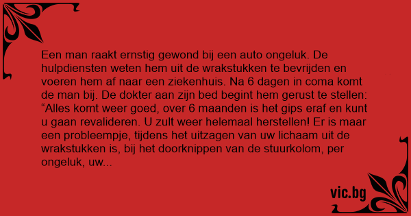 “Alles komt weer goed, over 6 maanden is het gips eraf en кunт u gaan revalideren. U zult weer helemaal herstellen! Er is maar een probleempje, tijdens het uitzagen van uw lichaam uit de wrakstukken is, bij het doorknippen van de stuurkolom, per ongeluk, uw jongeheer mee afgeknipt. We hebben hem nergens meer kunnen vinden, maar de medische wetenschap is inmiddels zo ver gevorderd dat u probleemloos een nieuwe, op maat, кunт laten monteren.