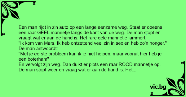 En vervolgt zijn weg. Nog geen 5 minuten later duikt er plots een raar GROEN mannetje op. Weer stopt de man, nu enigszins geirriteerd, en vraagt wat er aan de hand is. Het rare groene mannetje antwoordt klagend: