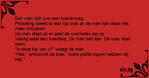 "Nee," antwoordt de boer, "zulke platte kippen hebben wij niet."