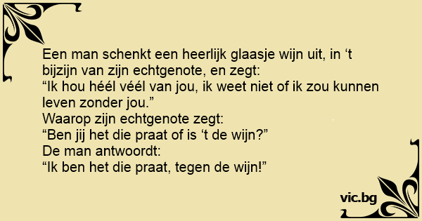 Een man schenkt een heerlijk glaasje wijn uit, in ‘t bijzijn van zijn echtgenote, en zegt: