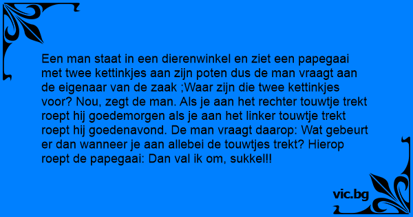 Een man staat in een dierenwinkel en ziet een papegaai met twee kettinkjes aan zijn poten dus de man vraagt aan de eigenaar van de zaak ;Waar zijn die twee kettinkjes voor? Nou, zegt de man. Als je aan het rechter touwtje trekt roept hij goedemorgen als je aan het linker touwtje trekt roept hij goedenavond. De man vraagt daarop: Wat gebeurt er dan wanneer je aan allebei de touwtjes trekt? Hierop roept de papegaai: Dan val ik om, suккеl!!