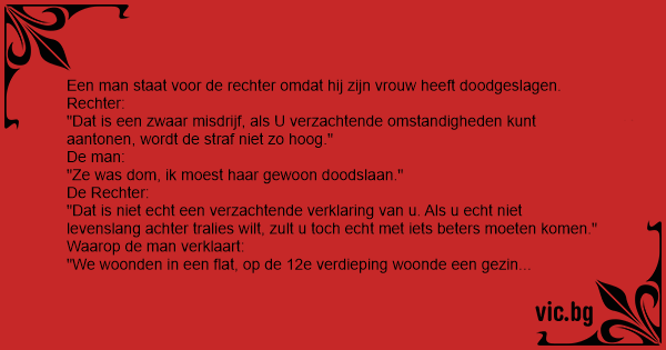 "Edelachtbare, U кunт zich voorstellen dat ik niet van plan was te zeggen dat het fragment is. Ik ging dus in mijn stoel zitten en las mijn krantje. Plotseling komt mijn vrouw met de volgende zin en ik denk