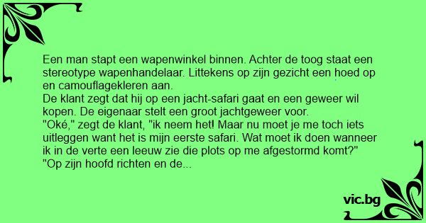 "Oké," zegt de klant, "ik neem het! Maar nu moet je me toch iets uitleggen want het is mijn eerste safari. Wat moet ik doen wanneer ik in de verte een leeuw zie die plots op me afgestormd komt?"
