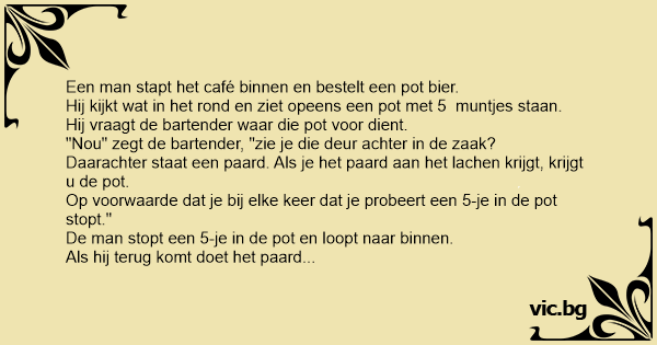 "Nee" zegt de bartender, "sinds u hier laatst was doet het paard niets anders meer dan lachen, wie het paard stil krijgt mag de рот mee naar huis nemen."