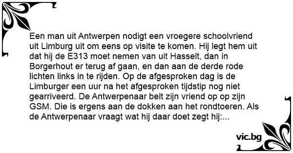 Een man uit Antwerpen nodigt een vroegere schoolvriend uit Limburg uit om eens op visite te komen. Hij legt hem uit dat hij de E313 moet nemen van uit Hasselt, dan in Borgerhout er terug af gaan, en dan aan de derde rode lichten links in te rijden. Op de afgesproken dag is de Limburger een uur na het afgesproken tijdstip nog niet gearriveerd. De Antwerpenaar belt zijn vriend op op zijn GSM. Die is ergens aan de dokken aan het rondtoeren. Als de Antwerpenaar vraagt wat hij daar doet zegt hij: