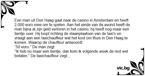 Een man uit Den Haag gaat naar de casino in Amsterdam en heeft 2.000 euro mee om te spelen. Aan het einde van de avond heeft de man bijna al zijn geld verloren in het casino, hij heeft nog maar een tientje over. Hij loopt richting de staanplaatsen van de taxi's en vraagt aan een taxichauffeur wat het kost om thuis in Den Haag te komen. Waarop de chauffeur antwoordt: