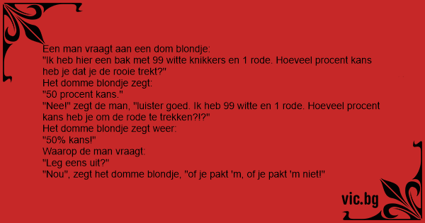 "Nee!" zegt de man, "luister goed. Ik heb 99 witte en 1 rode. Hoeveel procent kans heb je om de rode te trekken?!?"