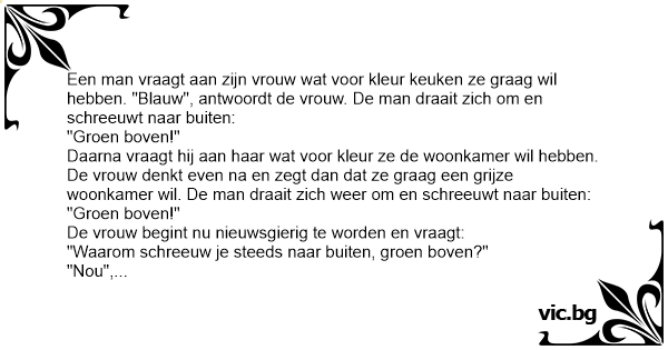 Een man vraagt aan zijn vrouw wat voor kleur keuken ze graag wil hebben. "Blauw", antwoordt de vrouw. De man draait zich om en schreeuwt naar buiten: "Groen boven!" Daarna vraagt hij aan haar wat voor kleur ze de woonkamer wil hebben. De vrouw denkt even na en zegt dan dat ze graag een grijze woonkamer wil. De man draait zich weer om en schreeuwt naar buiten: "Groen boven!" De vrouw begint nu nieuwsgierig te worden en vraagt: "Waarom schreeuw je steeds naar buiten, groen boven?" "Nou", zegt haar man, "er zijn namelijk Belgen graszoden aan het leggen."