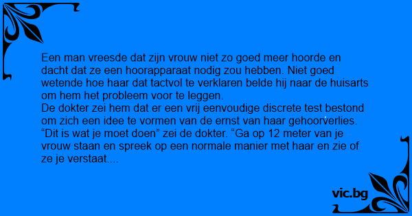 “Dit is wat je moet doen” zei de dokter. “Ga op 12 meter van je vrouw staan en spreek op een normale manier met haar en zie of ze je verstaat. Als dit niet lukt schuif dan telkens wat dichterbij en herhaal de vraag tot je een antwoord krijgt. “