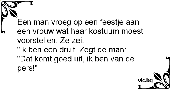 Een man vroeg op een feestje aan een vrouw wat haar kostuum moest voorstellen. Ze zei: