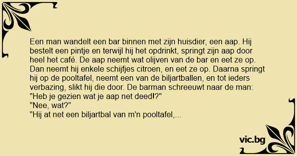Een man wandelt een bar binnen met zijn huisdier, een aap. Hij bestelt een pintje en terwijl hij het opdrinkt, springt zijn aap door heel het café. De aap neemt wat olijven van de bar en...