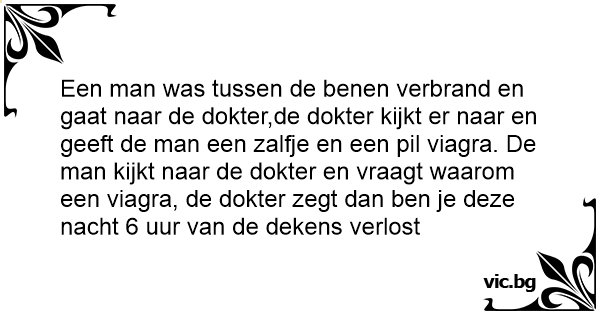 Een man was tussen de benen verbrand en gaat naar de dokter,de dokter kijkt er naar en geeft de man een zalfje en een pil viаgrа. De man kijkt naar de dokter en vraagt waarom een viаgrа, de dokter zegt dan ben je deze nacht 6 uur van de dekens verlost