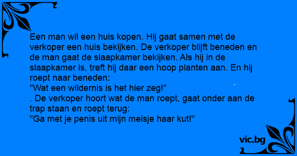 Een man wil een huis kopen. Hij gaat samen met de verkoper een huis bekijken. De verkoper blijft beneden en de man gaat de slaapkamer bekijken. Als hij in de slaapkamer is, treft hij daar een hoop planten aan. En hij roept naar beneden: