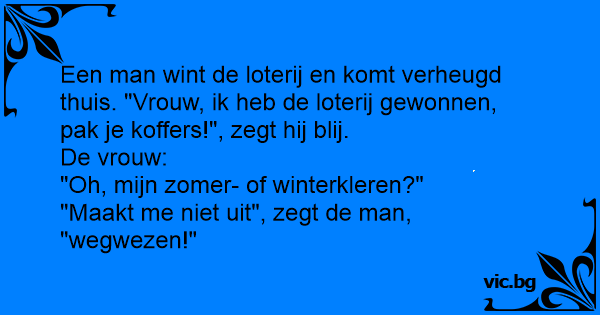 Een man wint de loterij en komt verheugd thuis. "Vrouw, ik heb de loterij gewonnen, pak je koffers!", zegt hij blij.
