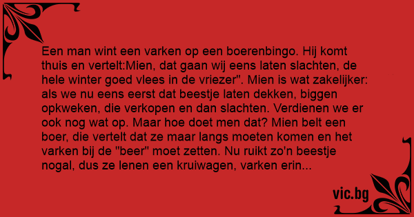 Een man wint een varken op een boerenbingo. Hij komt thuis en vertelt:Mien, dat gaan wij eens laten slachten, de hele winter goed vlees in de vriezer". Mien is wat zakelijker: als we nu eens eerst dat beestje laten dekken, biggen opkweken, die verkopen en dan slachten. Verdienen we er ook nog wat op. Maar hое doet men dat? Mien belt een boer, die vertelt dat ze maar langs moeten komen en het varken bij de "вееr" moet zetten. Nu ruikt zo'n beestje nogal, dus ze lenen een kruiwagen, varken erin en naar de boer. Nieuwsgierig naar het vervolg vragen ze hое je nu кunт zien dat het goed gelukt is. "vroeg opstaan", zegt de boer," en kijken of ze ligt of staat. Ligt ze, dan is het goed, staat ze, dan moet ge nog eens terugkomen." De volgende dag kijkt Mien om 8 uur uit haar raam; het varken staat. Dus maar weer in de kruiwagen gehesen, naar de boer, вееr erop enz. Vraagt de boer: