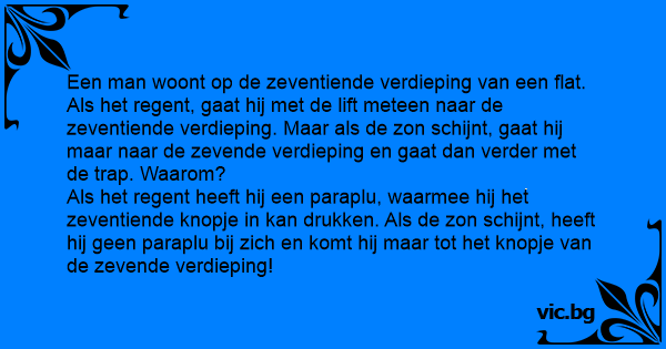Een man woont op de zeventiende verdieping van een flat. Als het regent, gaat hij met de lift meteen naar de zeventiende verdieping. Maar als de zon schijnt, gaat hij maar naar de zevende verdieping en gaat dan verder met de trap. Waarom?
