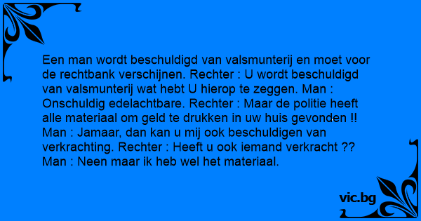 Een man wordt beschuldigd van valsmunterij en moet voor de rechtbank verschijnen. Rechter : U wordt beschuldigd van valsmunterij wat hebt U hierop te zeggen. Man : Onschuldig edelachtbare. Rechter : Maar de politie heeft alle materiaal om geld te drukken in uw huis gevonden !! Man : Jamaar, dan kan u mij ook beschuldigen van verkrachting. Rechter : Heeft u ook iemand verkracht ?? Man : Neen maar ik heb wel het materiaal.