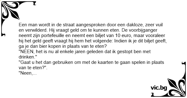 Een man wordt in de straat aangesproken door een dakloze, zeer vuil en verwilderd. Hij vraagt geld om te kunnen eten. De voorbijganger neemt zijn portefeuille en neemt een biljet van 10 euro, maar vooraleer hij het geld geeft vraagt hij hem het volgende: Indien ik je dit biljet geeft, ga je dan bier kopen in plaats van te eten?