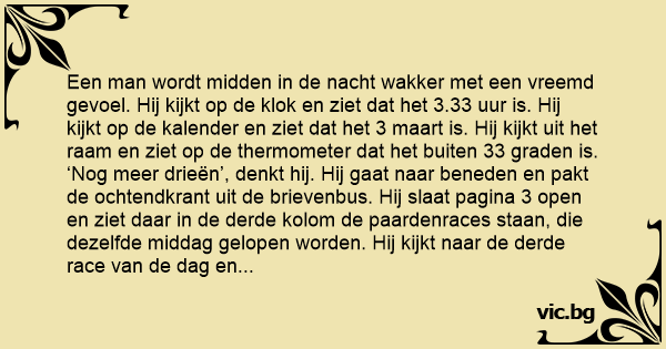 Een man wordt midden in de nacht wakker met een vreemd gevoel. Hij kijkt op de klok en ziet dat het 3.33 uur is. Hij kijkt op de kalender en ziet dat het 3 maart is. Hij kijkt uit het raam en ziet op de thermometer dat het buiten 33 graden is. ‘Nog meer drieën’, denkt hij. Hij gaat naar beneden en pakt de ochtendkrant uit de brievenbus. Hij slaat pagina 3 open en ziet daar in de derde kolom de paardenraces staan, die dezelfde middag gelopen worden. Hij kijkt naar de derde race van de dag en ziet dat er een paard aan deelneemt dat Trio heet. Hij besluit die ochtend al zijn geld van de bank te halen en gaat daarmee naar een gokkantoor om het op Trio in te zetten. 's Middags gaat hij vol goede moed naar de race om... Trio derde te zien worden.