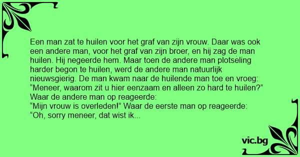 Een man zat te huilen voor het graf van zijn vrouw. Daar was ook een andere man, voor het graf van zijn broer, en hij zag de man huilen. Hij negeerde hem. Maar toen de andere man plotseling harder begon te huilen, werd de andere man natuurlijk nieuwsgierig. De man kwam naar de huilende man toe en vroeg: