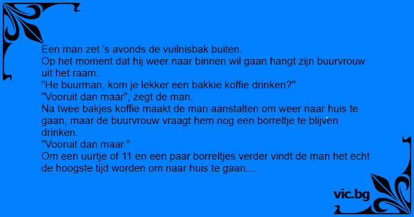 Na twee bakjes koffie maakt de man aanstalten om weer naar huis te gaan, maar de buurvrouw vraagt hem nog een borreltje te blijven drinken.