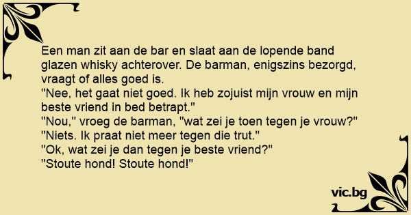 En mands allerbedste ven. - Jeg synes, du hænger med ørerne? - Min kone er stukket af med min bedste ven… - Jamen, du godeste! Hvad gør du arme stakkel nu? - Ja, jeg må vel ud og købe mig en ny hund.