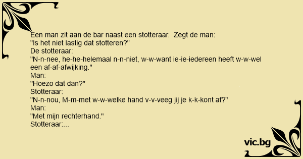 Een man zit aan de bar naast een stotteraar. Zegt de man: