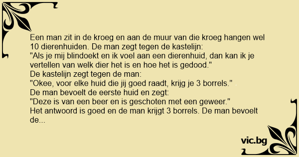 Een man zit in de kroeg en aan de muur van die kroeg hangen wel 10 dierenhuiden. De man zegt tegen de kastelijn: