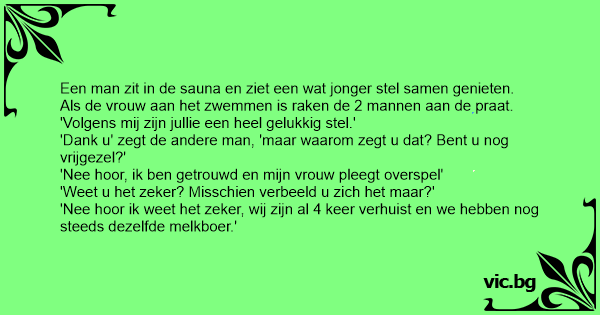 'Dank u' zegt de andere man, 'maar waarom zegt u dat? Веnт u nog vrijgezel?'
