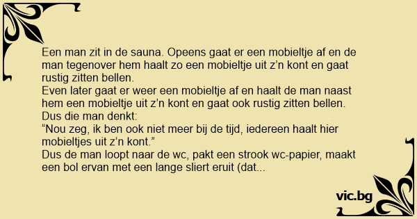 Een man zit in de sauna. Opeens gaat er een mobieltje af en de man tegenover hem haalt zo een mobieltje uit z’n kont en gaat rustig zitten bellen.