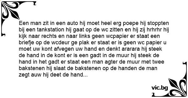 Een man zit in een auto hij moet heel erg poepe hij stoppten bij een tankstation hij gaat op de wc zitten en hij zij hrhrhr hij kijk naar rechts en naar links geen wcpapier er staat een briefje op de wcdeur ge plak er staat er is geen wc papier u moet uw kont afvegen uw hand en denkt ararara hij steek de hand in de kont er is een gadt in de muur hij steek de hand in het gadt er staat een man agter de muur met twee bakstenen hij slaat de bakstenen op de handen de man zegt auw hij deet de hand in de mond en zegt BAAAAAAAAAAAAAAAA....