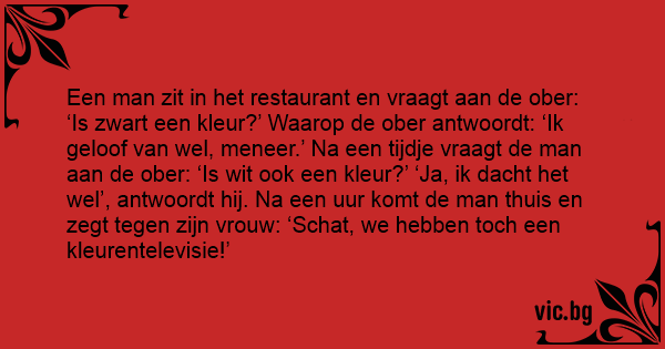 Een man zit in het restaurant en vraagt aan de ober: ‘Is zwart een kleur?’ Waarop de ober antwoordt: ‘Ik geloof van wel, meneer.’ Na een tijdje vraagt de man aan de ober: ‘Is wit ook een kleur?’ ‘Ja, ik dacht het wel’, antwoordt hij. Na een uur komt de man thuis en zegt tegen zijn vrouw: ‘Schat, we hebben toch een kleurentelevisie!’