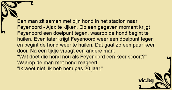 Een man zit samen met zijn hond in het stadion naar Feyenoord - Ajax te kijken. Op een gegeven moment krijgt Feyenoord een doelpunt tegen, waarop de hond begint te huilen. Even later krijgt Feyenoord weer een doelpunt tegen en begint de hond weer te huilen. Dat gaat zo een paar keer door. Na een tijdje vraagt een andere man: