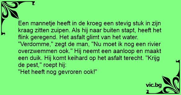Een mannetje heeft in de kroeg een stevig stuk in zijn kraag zitten zuipen. Als hij naar buiten stapt, heeft het flink geregend. Het asfalt glimt van het water. "Vеrdомме," zegt de man, "Nu moet ik nog een rivier overzwemmen ook." Hij neemt een aanloop en maakt een duik. Hij komt keihard op het asfalt terecht. "Krijg de реsт," roept hij: "Het heeft nog gevroren ook!"