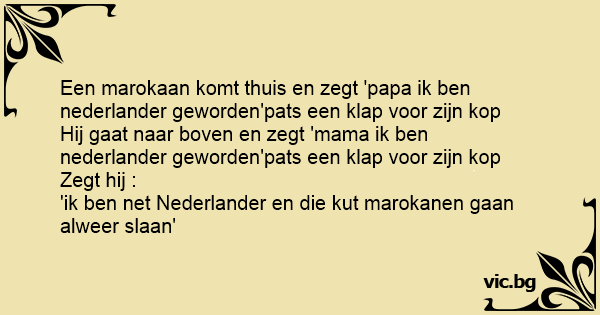 Hij gaat naar boven en zegt 'mama ik ben nederlander geworden'pats een klap voor zijn kop